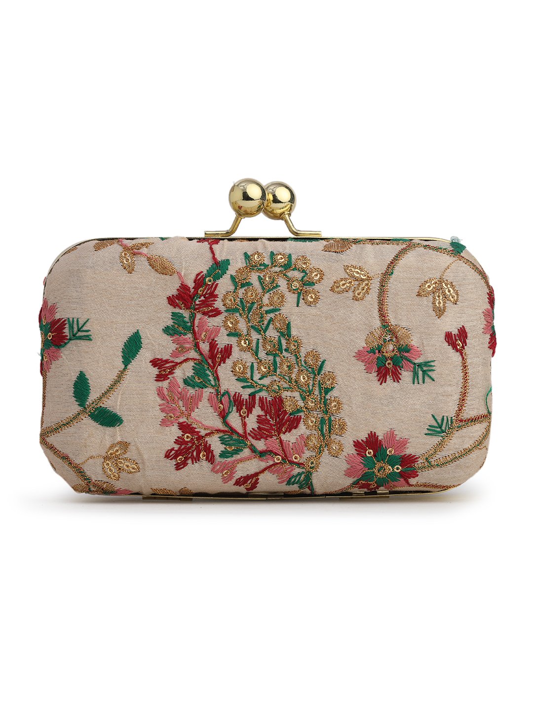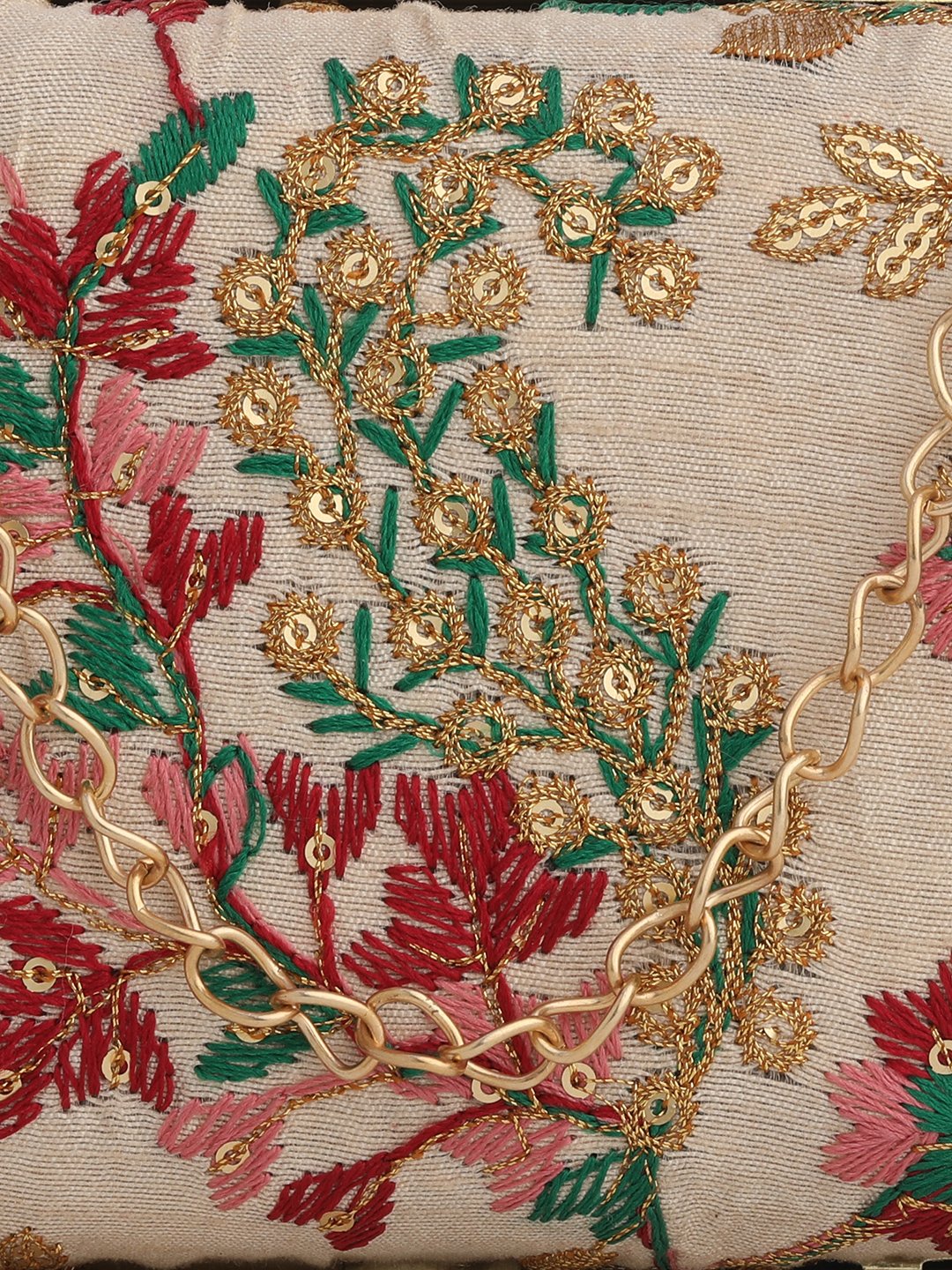 Peach & Green Embroidered Box clutches, Has gold chain shoulder strap, 1 main compartment with twist closure